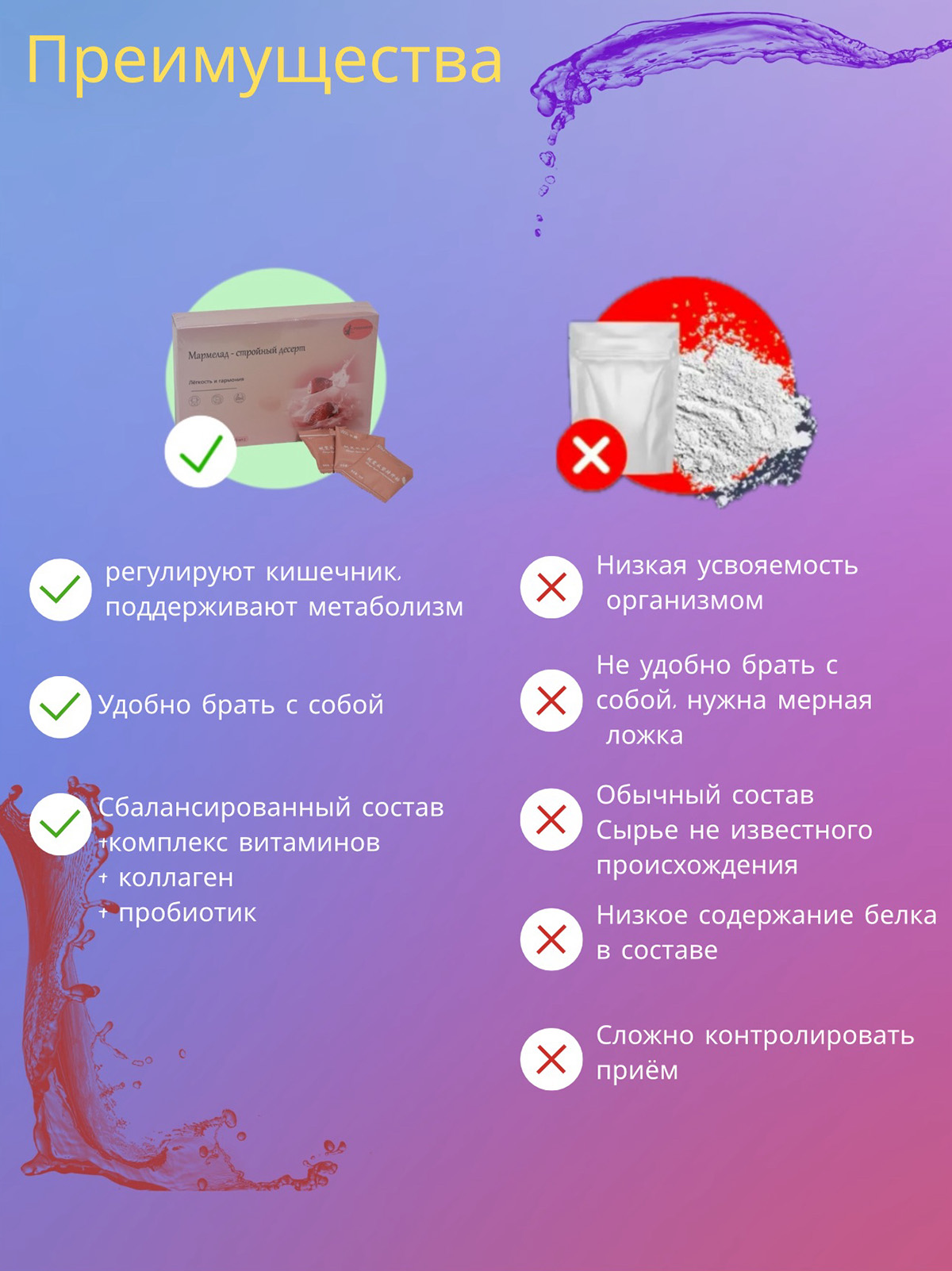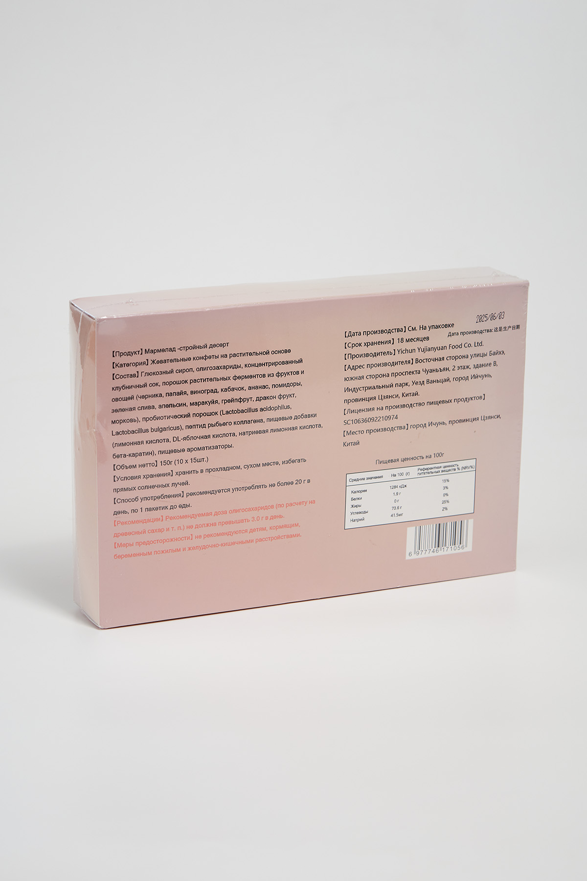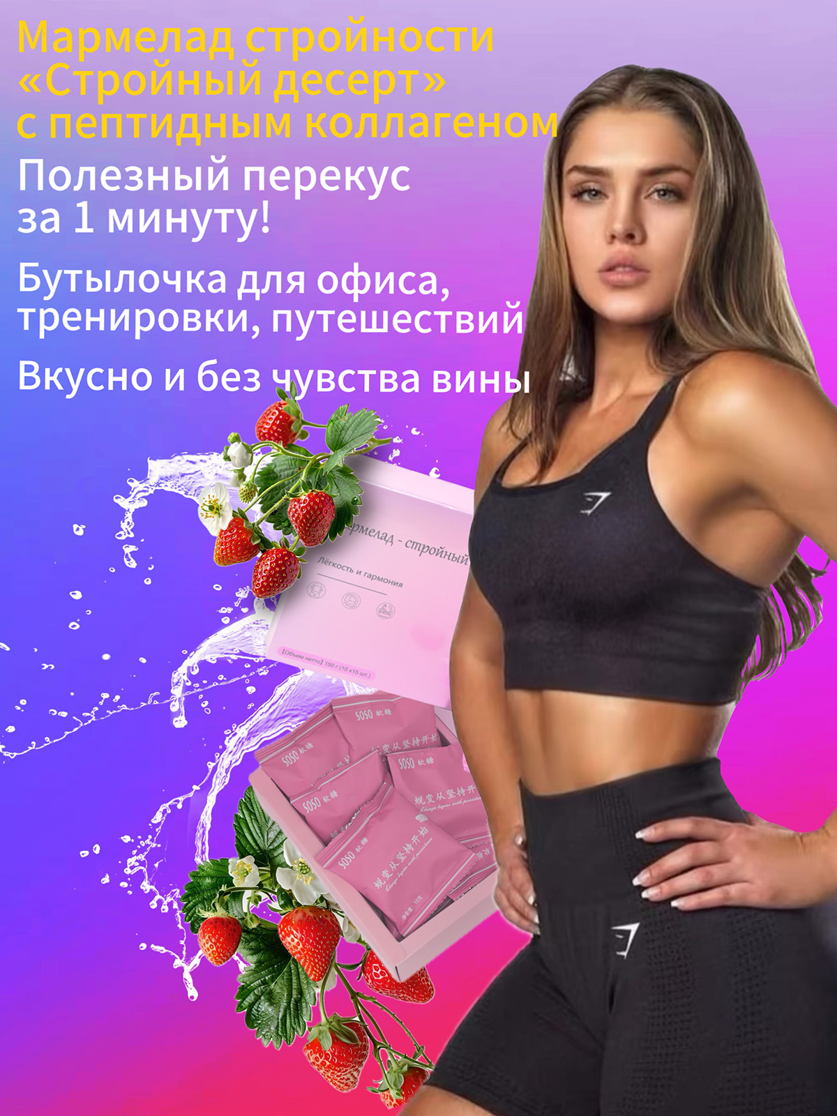 Этот мармелад обогащен пептидом рыбьего коллагена и лактобактериями, которые способствуют очищению организма от токсинов и поддерживают здоровую микрофлору кишечника. Благодаря низкому содержанию жиров и наличию пробиотиков, мармелад "Детокс" может быть частью сбалансированного рациона для тех, кто следит за своим весом. Приятный фруктовый вкус делает его отличным перекусом в течение дня. Состав тщательно разрабатывается специалистами в области здорового питания, чтобы сочетание натуральных ингредиентов было максимально эффективным и полезным. Натурально! Без сахара! Вкусно!Мармелад, произведенный на основе свежих ягод, фруктов и овощей без добавления сахара. Произведен по специальной технологии, позволяющей сохранить все полезные свойства используемых ингредиентов. В состав Жевательного мармелада входят специально подобранные компоненты, способствующие очищению организма и похудению. Продукт сертифицирован и подходит для всей семьи. Нежная фруктовая основа сделана из натуральных экстрактов, а пектин обеспечивает приятную консистенцию.Эти сладости станут прекрасным подарком для подруги или любимого человека. Хорошо усваивается организмом. Содержит витамины и полезные кислоты. Удобная упаковка в саше. Удобно брать с собой. Способ применения: Рекомендуется употреблять по одному стику один-два раза в день. Противопоказания: индивидуальная непереносимость компонентов, беременность, кормление грудью, детский возраст. Не является биологически активной добавкой БАД или лекарственным средством, является средством профилактики.