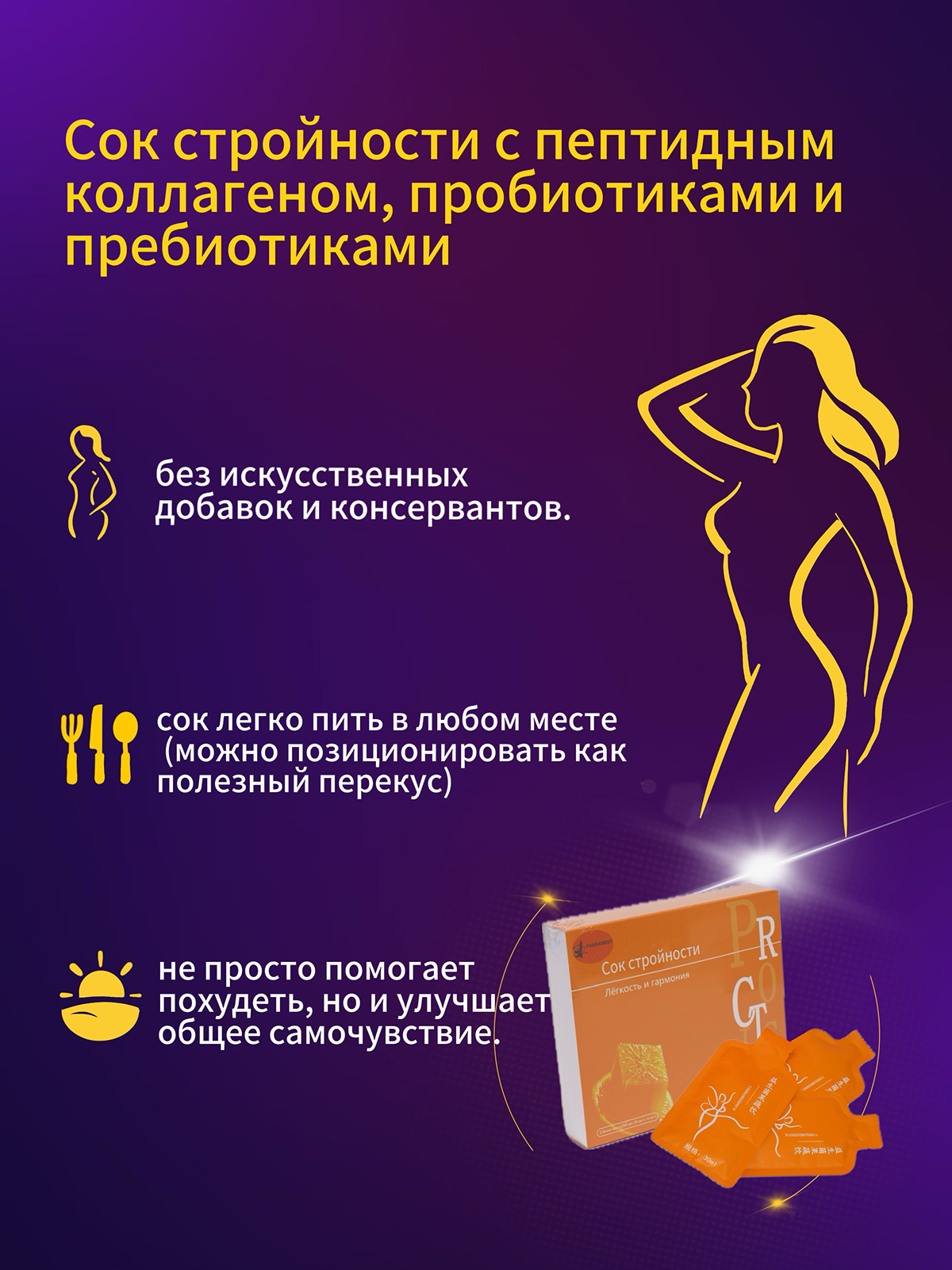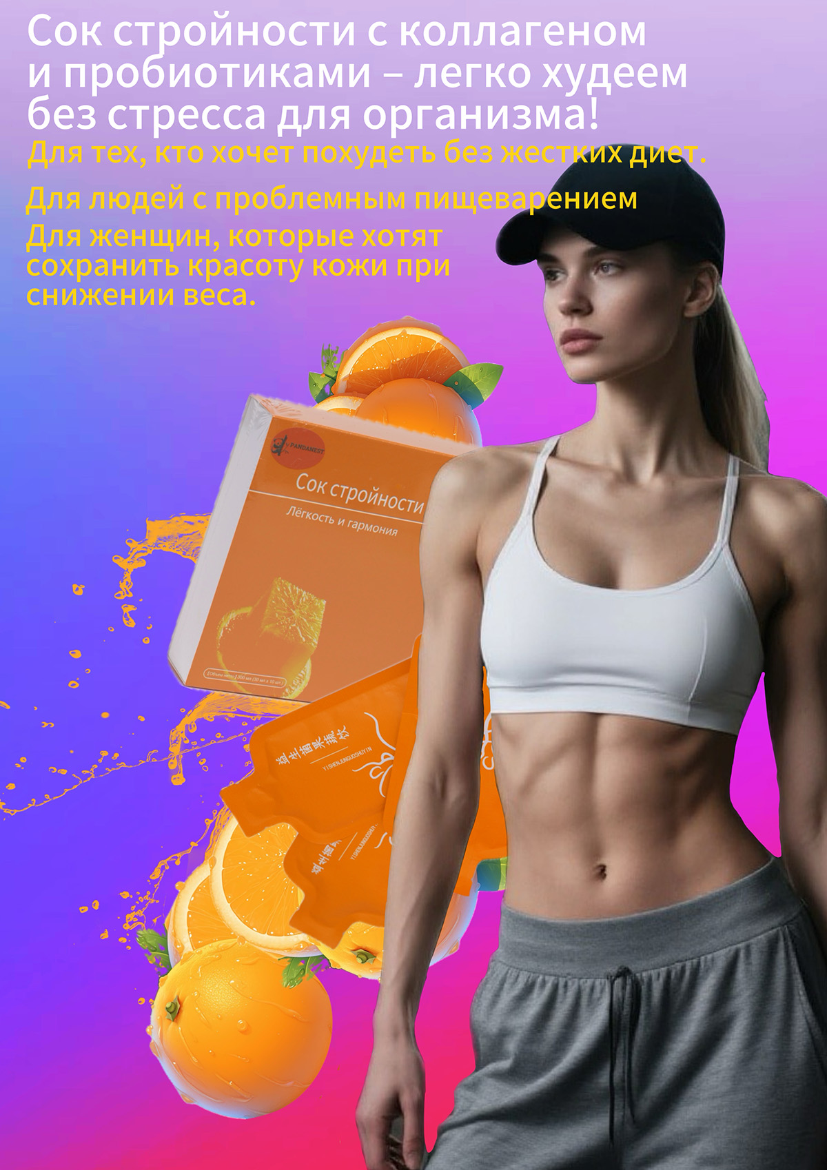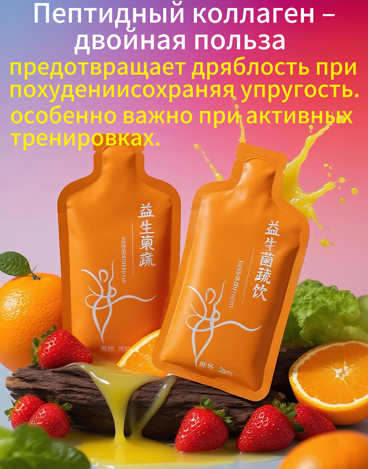 Сок стройности пептидный коллаген с пробиотиками для похудения – это вкусный и эффективный способ заботиться о своем здоровье и внешнем виде. Напиток содержит пептид рыбьего коллагена, который способствует укреплению суставов и улучшению состояния кожи, волос и ногтей. Пробиотики в составе поддерживают здоровую микрофлору кишечника, что положительно сказывается на общем самочувствии и способствует похудению. Удобная форма выпуска в стиках по 30 мл позволяет брать напиток с собой и употреблять в любое время. Сладкий апельсиновый вкус сделает процесс похудения приятным и комфортным.
