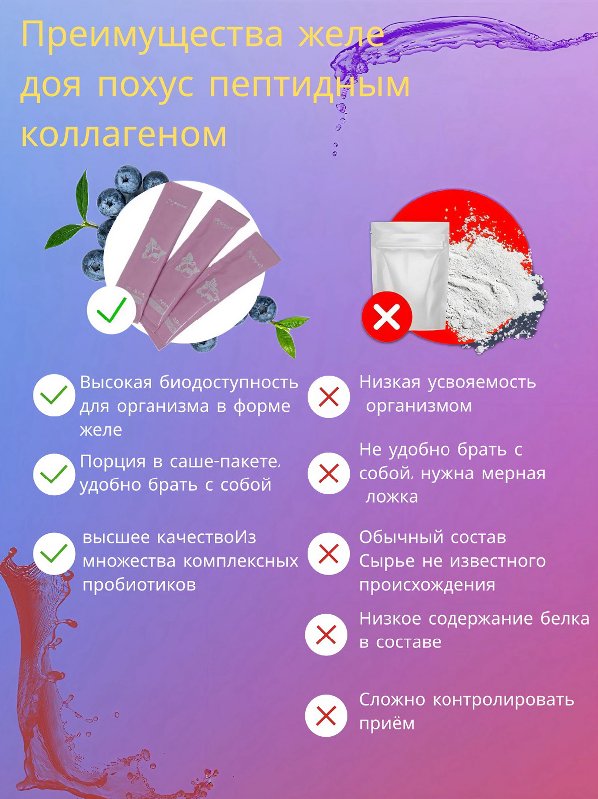 Хорошо усваивается организмом. Содержит витамины и полезные кислоты. Удобная упаковка в саше. Удобно брать с собой. Его не нужно разбавлять водой. Коллаген сразу готов к употреблению.